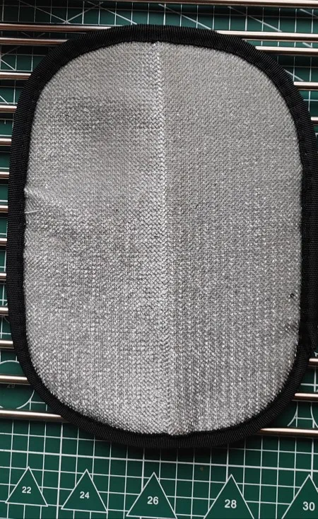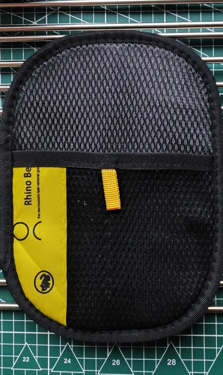 El guante removedor de pelos Magic Brush™ mide 24 × 16 cm y está fabricado con una resistente malla en la parte posterior, combinada con cerdas de tela suave que generan estática para levantar y atrapar pelos al contacto.